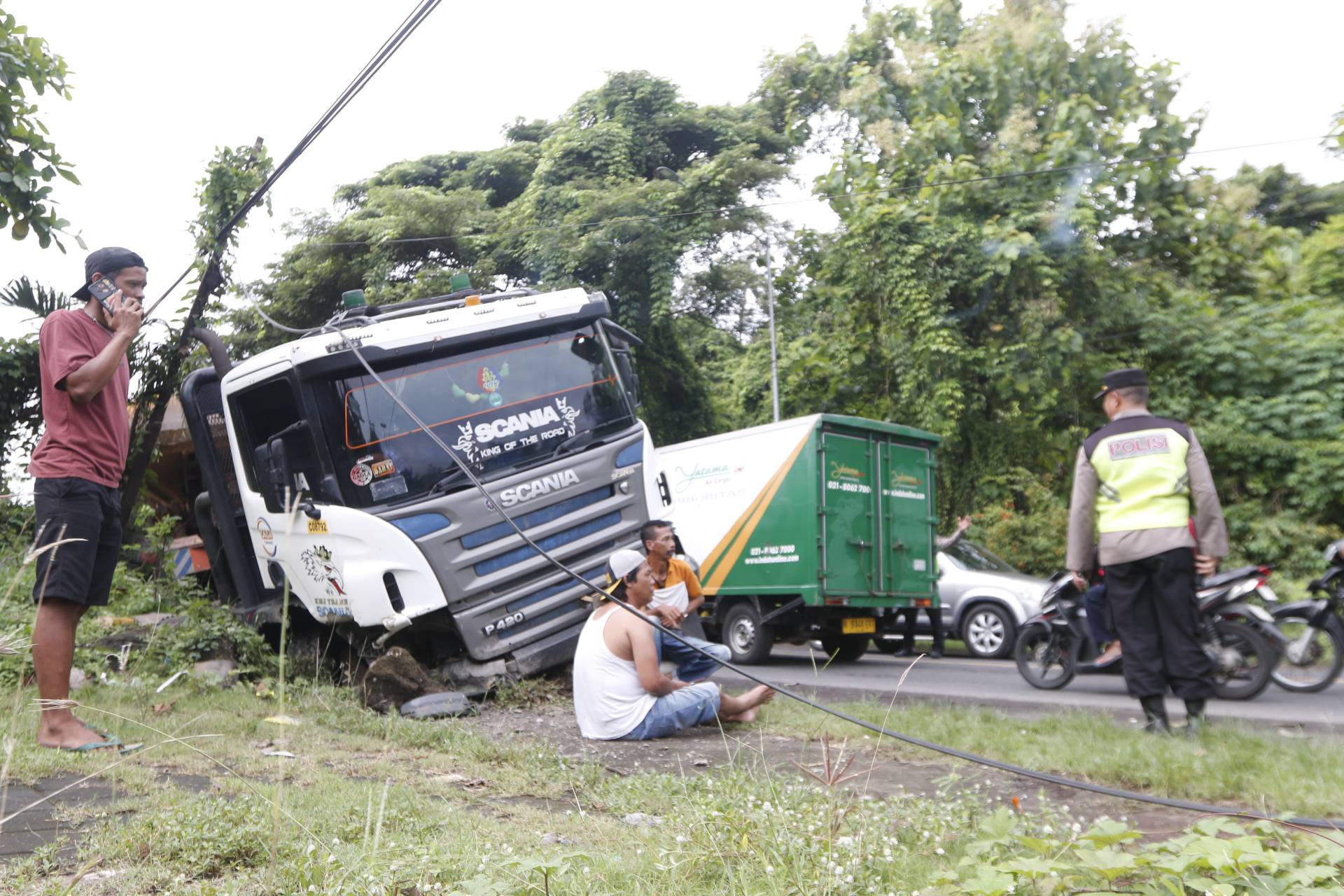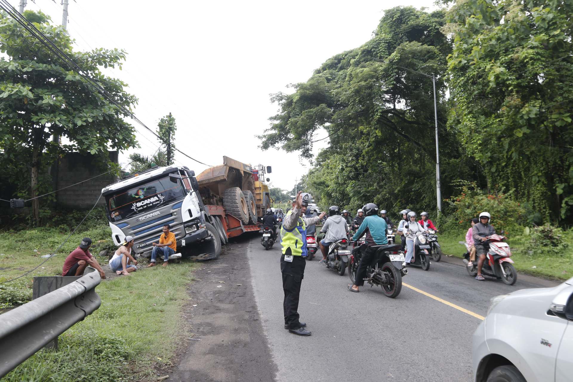 Sebuah truk trailer bernomor polisi B 9655 UIW yang sedang mengangkut alat berat dilaporkan terperosok ke parit di sisi kanan jalan sebelum melintasi jembatan. Peristiwa tersebut menyebabkan arus lalu lintas di jalur nasional terganggu dan harus diberlakukan sistem buka tutup.