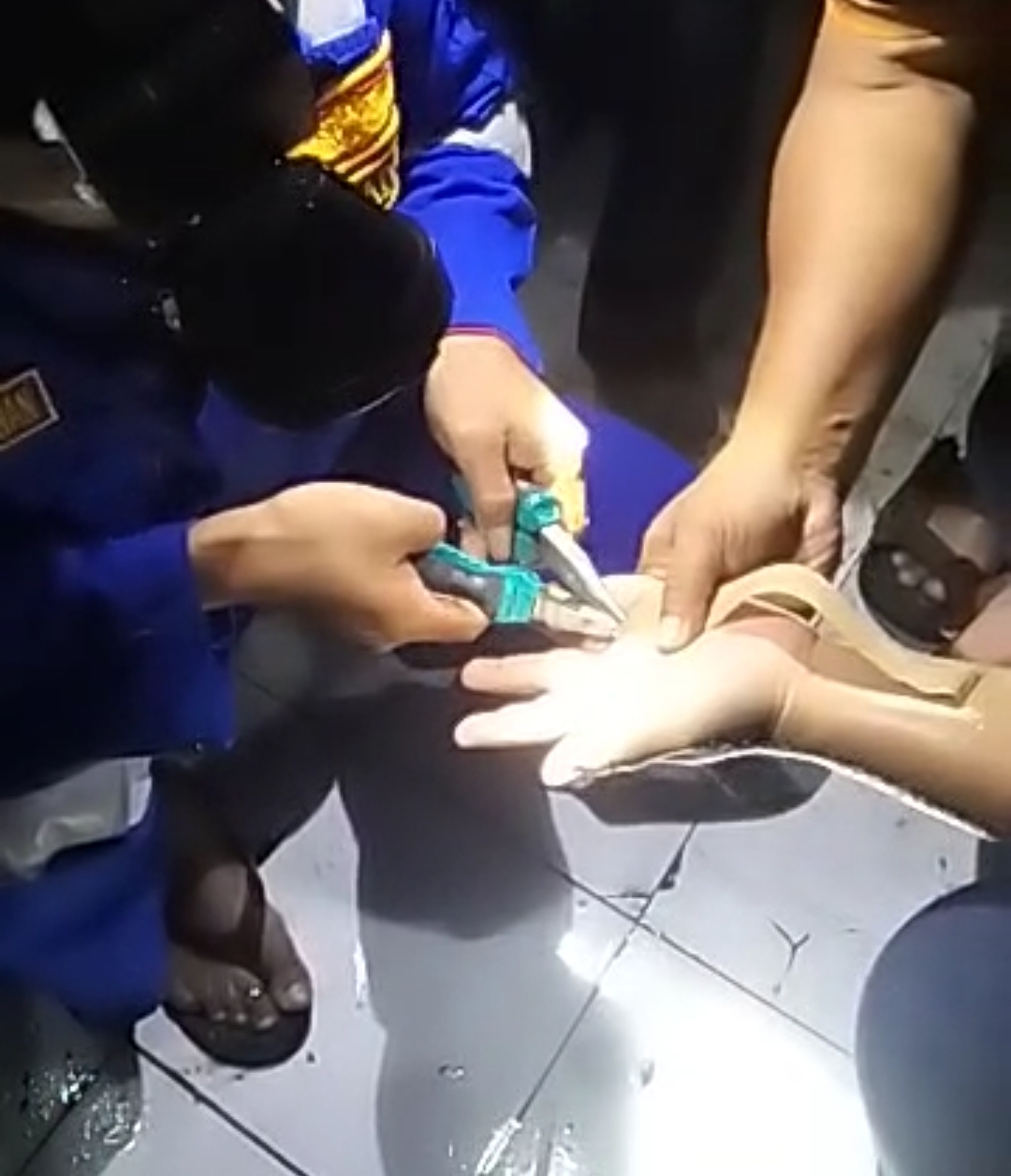 Menurut keterangan petugas, cincin tersebut tidak dapat dilepas secara manual karena kondisi jari yang sudah membengkak. Tim kemudian menggunakan sejumlah peralatan, antara lain gerinda, tang, dan senter untuk melakukan pemotongan cincin secara hati-hati agar tidak melukai korban.