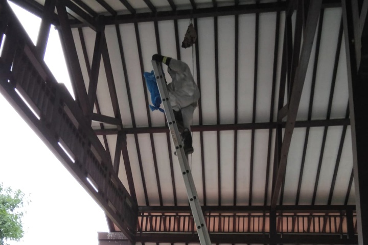 Setibanya di lokasi, tim langsung disambut suara dengungan tajam dari puluhan tawon vespa yang mulai keluar dari sarang. Kondisi ini memaksa petugas untuk bergerak cepat namun tetap ekstrem hati-hati. Proses penanganan dimulai pukul 14.15 WIB, dengan petugas harus masuk mendekati plafon sambil menghadapi gerombolan tawon yang beberapa kali melakukan serangan ke arah APD.