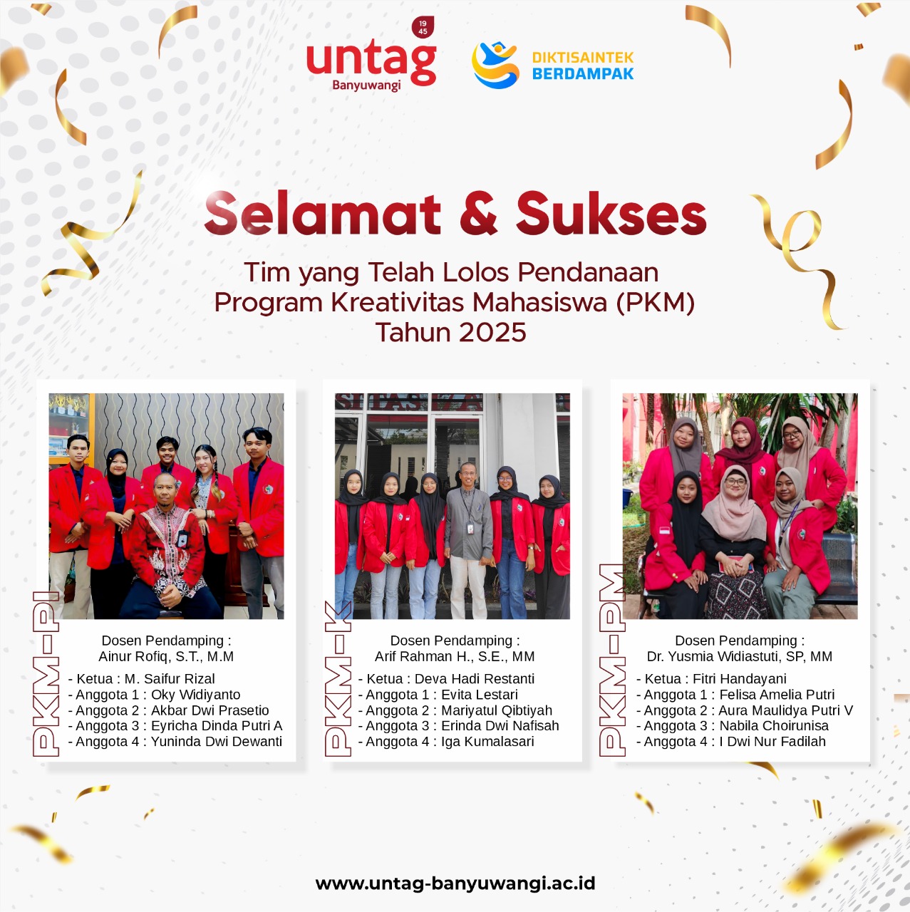 Tiga tim Untag Banyuwangi yang berhasil lolos berasal dari program P2MW (Program Pembinaan Mahasiswa Wirausaha), yakni: